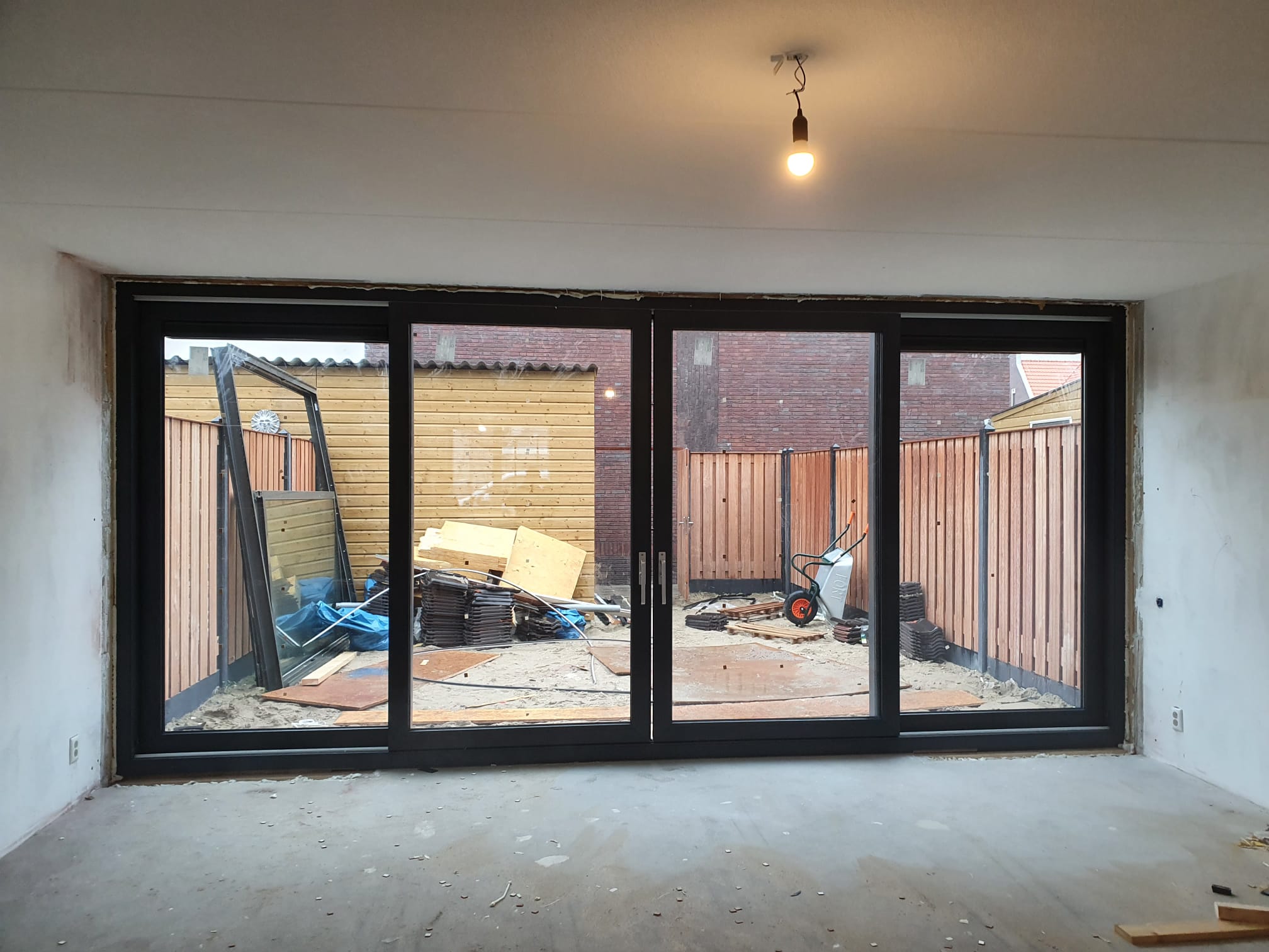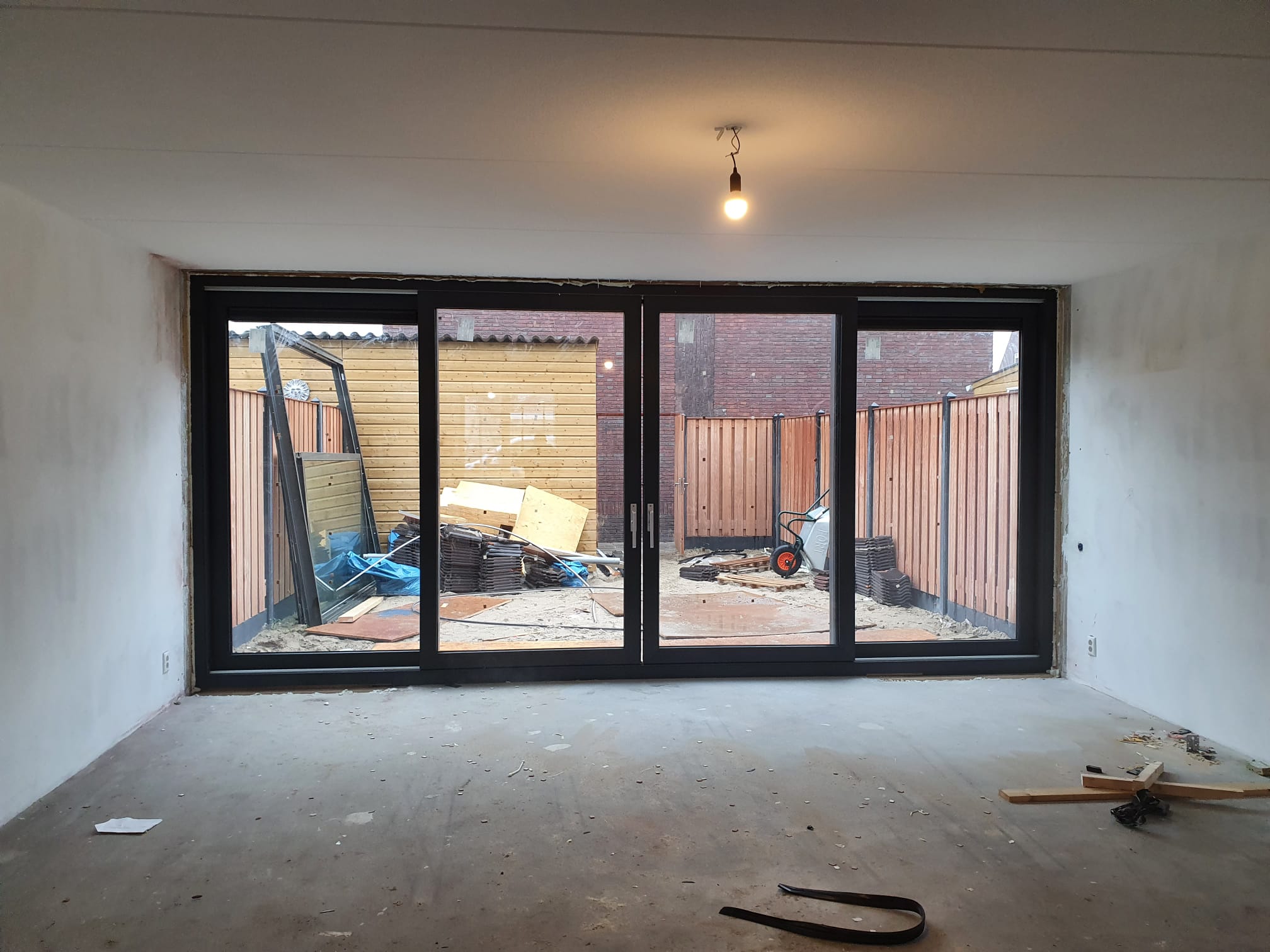 Het verzoek was meer licht in de woning. Om dit te realiseren hebben we de linker en rechter muur verwijderd. Het gat wat is ontstaan loopt van wand tot wand. Vervolgens hebben we ons, exact op maat gemaakte, kunststof schuifpui in die opening geplaatst.