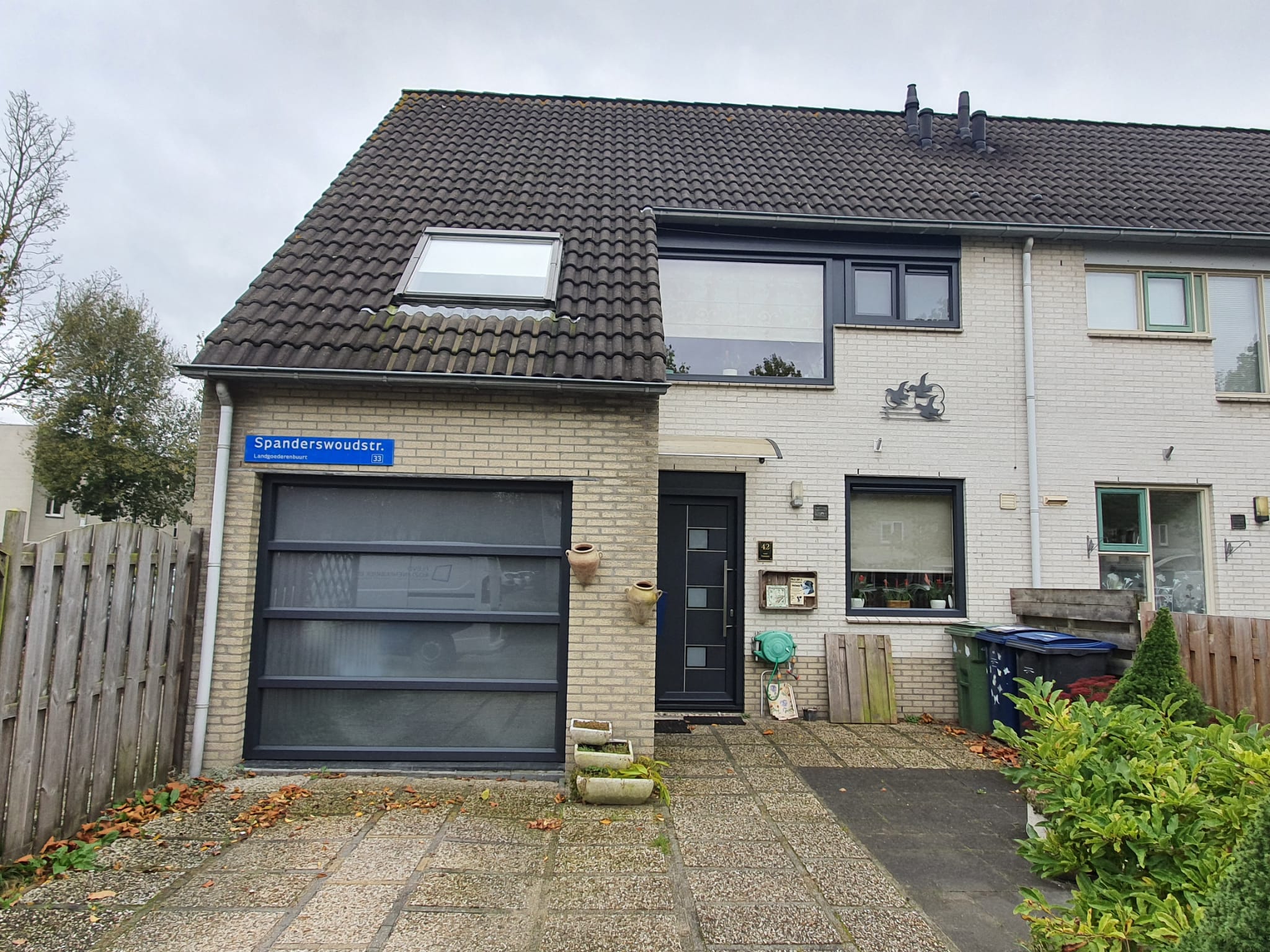 Genoeg woordgrapjes...het verschil is enorm. De oude, niet geïsoleerde garagedeur hebben we vervangen door een goed geïsoleerd kunststof kozijn op kleur. Deze kleur hebben we verder doorgevoerd in de kunststof kozijnen voor de hele benedenverdieping en bovenverdieping. Verder hebben we in dezelfde kleur een nieuwe kunststof voordeur en zijdeur geplaatst.